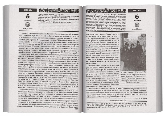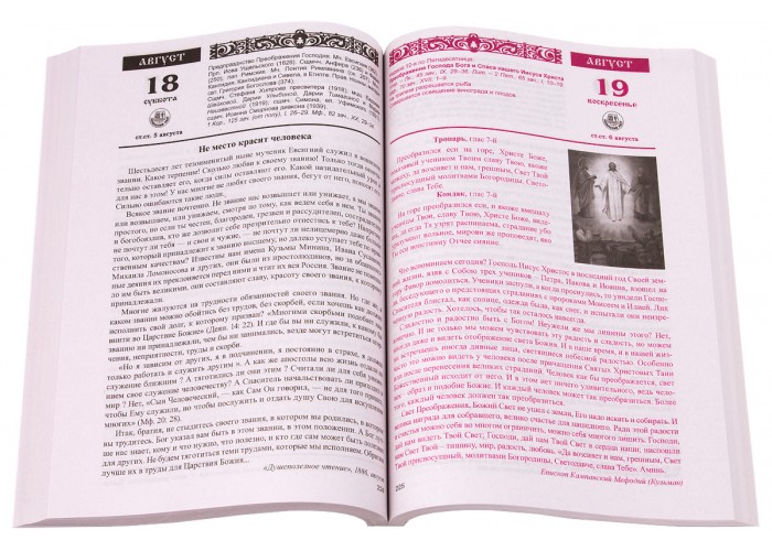 Православный церковный календарь содержит душеполезные чтения на каждый день года, выбранные из творений святых отцов, известных церковных проповедников и подвижников. По смыслу и количеству текста статьи приспособлены для ежедневного прочтения и, как правило, относятся к событиям, празднуемым Церковью в этот день. При внимательном прочтении календарь поможет верующим глубже проникнуться духом церковного вероучения и смыслом ежедневной церковной жизни. Прилагаемая календарная сетка и указатель ежедневных чтений из Священного Писания соответствуют официальному церковному календарю.