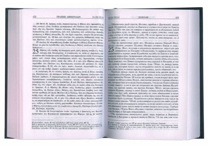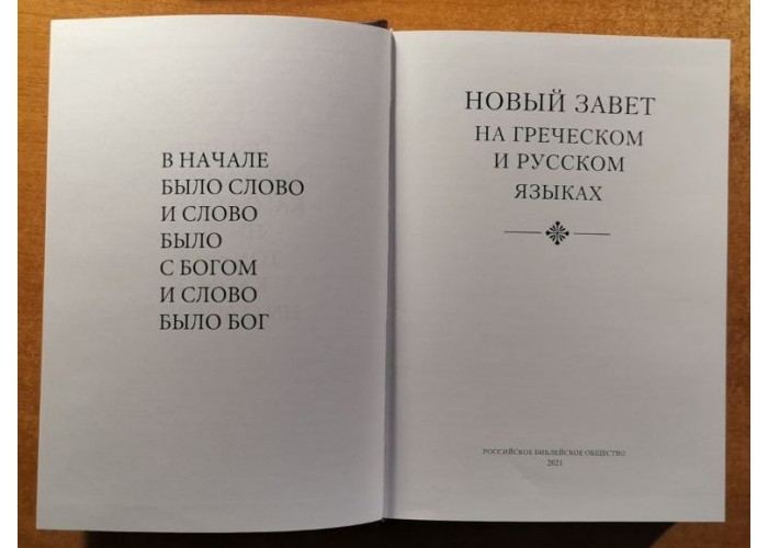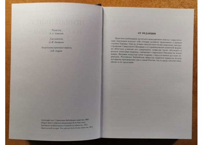 Впервые выпуская такое издание с параллельным русским переводом, Российское Библейское общество надеется принести пользу духовному просвещению как в самой России, так и среди соотечественников за ее пределами.